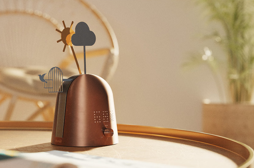 Aware of the fact that we spend most of our time inside, the designers equipped Skymill to also read the conditions indoors. By pushing the knob twice, the display will show you the temperature and humidity of your home. The device can also check for carbon dioxide (CO₂), airborne chemicals (VOCs), and dust (PM2.5). If Skymill detects the values of these are above the recommended levels for more than 10 minutes, a bird icon will pop out—a nod to a canary in a coal mine—to let you know. “It’s not an alarm. Just a quiet nudge to let in some fresh air,” the designers explain.
