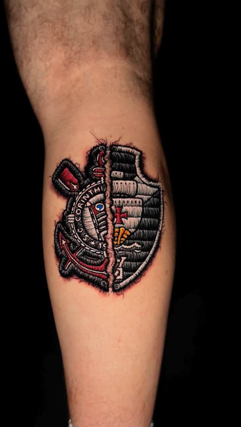 Brazilian tattoo artist Vinícius Moschen inks nostalgic tattoos designs inspired by embroidery patches.