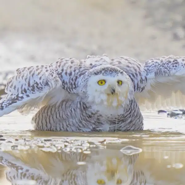 José arrived at the houbara’s courtship site at night. By the light of the moon, he dug himself a low hide. From this vantage point he caught the bird’s full puffed-out profile as it took a brief rest from its frenzied performance.