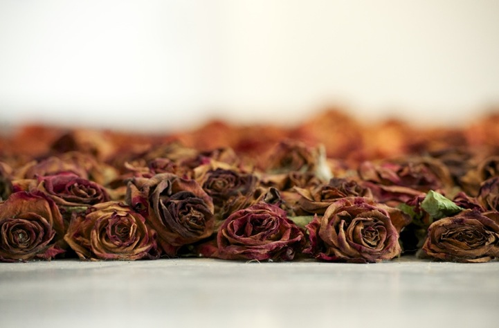 For a small window of time, the piece is a gorgeous display of velvety flowers that viewers will want to reach out and touch. But, the artist is more interested in what happens next. As the roses gradually wither and die, Gallaccio says, “I like the mixture of celebration with death or decay.” The dying flowers are a visual gesture of passion, but the artist doesn't want it to be a sentimental piece. She focuses more on the collaboration between herself and the objects, and enjoys the enigmatic process of natural decay.