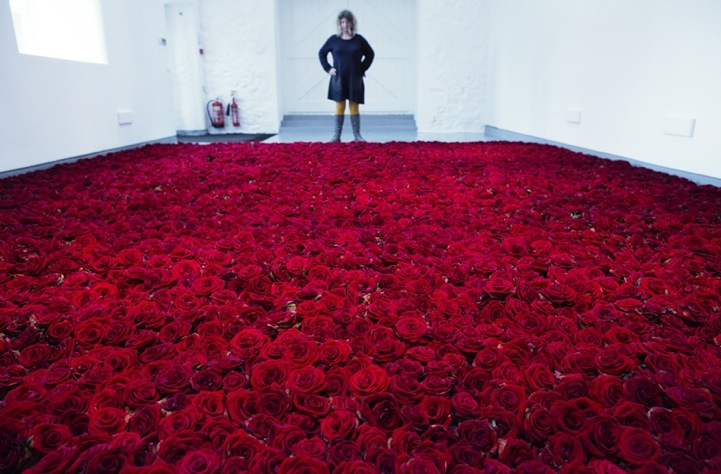 Using all kinds of materials, including trees, flowers, candles, sand, and ice, London-based artist Anya Gallaccio creates site-specific artworks that explore the ephemerality of nature. In particular, Red on Green is a stunning display of 10,000 fresh roses that were arranged within a gallery space. Gallaccio pulled the heads off of the roses and arranged them into a tightly packed rectangle.