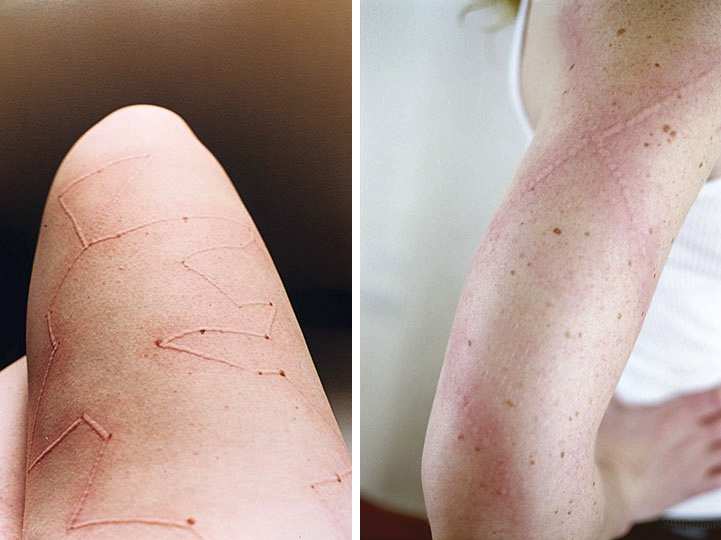 The artist explains: “[I have] a condition in which one's immune system releases excessive amounts of histamine, causing capillaries to dilate and welts to appear (lasting about thirty minutes) when the hypersensitive skin's surface is lightly scratched. This allows me to painlessly draw on my skin with just enough time to photograph the results. Even though I can direct this ephemeral response by drawing on it, the reaction is involuntary, much like the uncontrollable nature of a blush.”