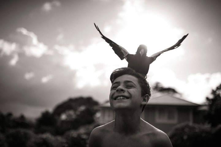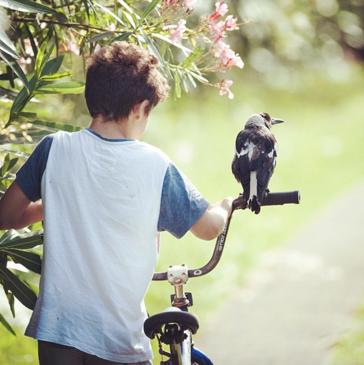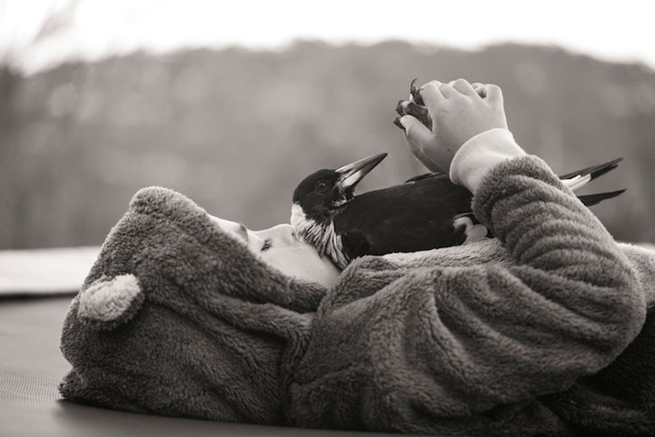 When the Bloom family took an abandoned baby magpie under their wing over a year ago, they had no idea the chick would become a loving, permanent member of their clan in Sydney, Australia. The bird–named Penguin because of her coloring–was only a few weeks old when she was found on the ground near the library by young Noah back in late 2013. After consulting a family friend who is an experienced veterinarian, husband and wife Cameron and Sam Bloom and their three children (Rueben, 13, Noah, 11, and Oli, 9) nursed the young magpie back to health.