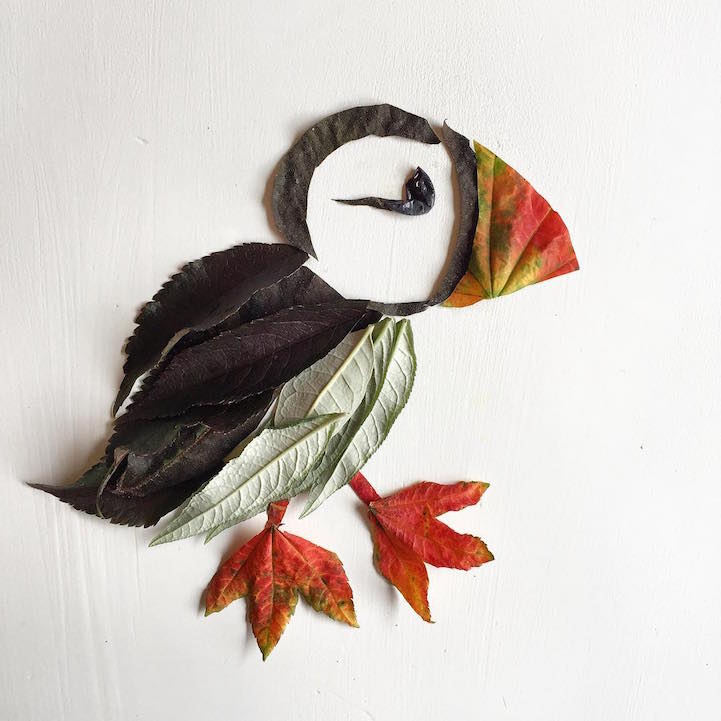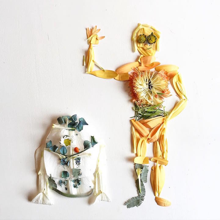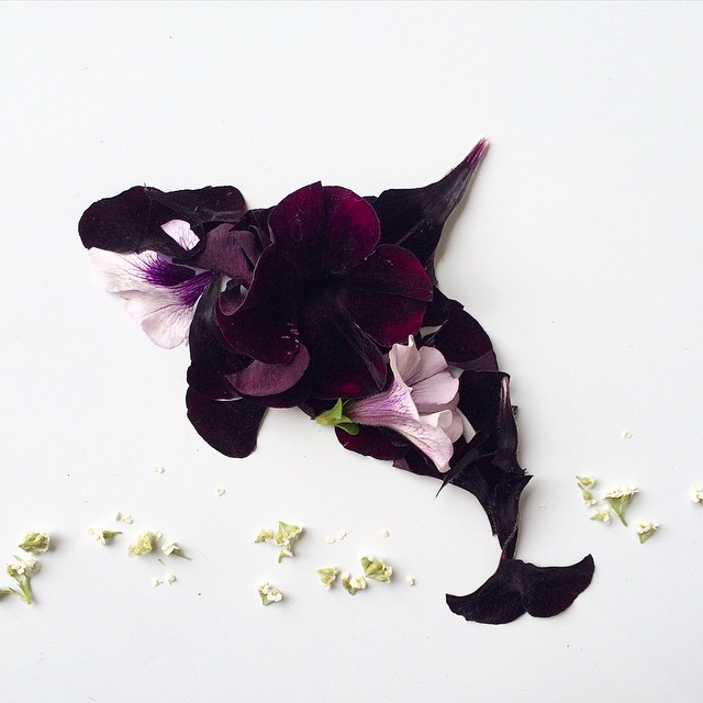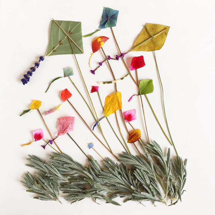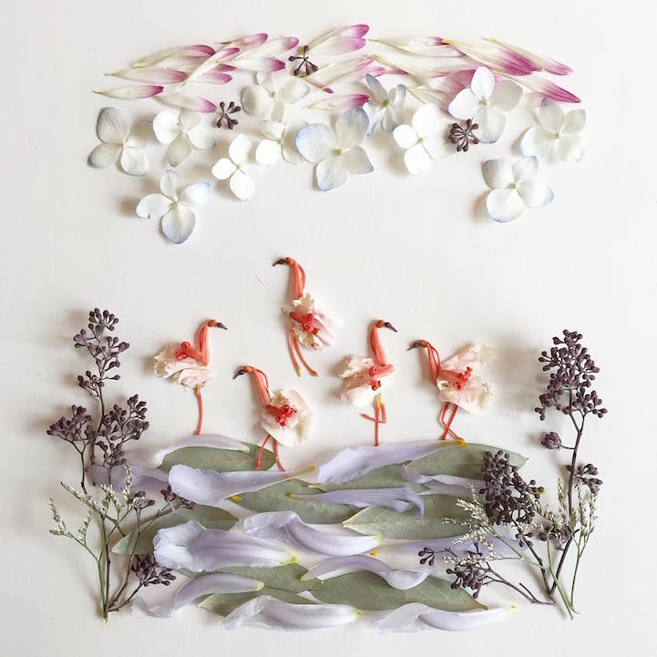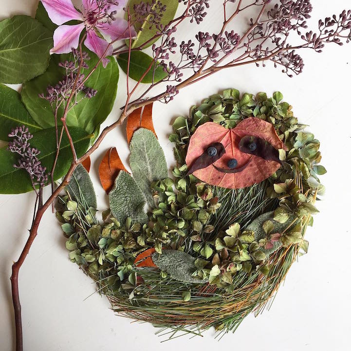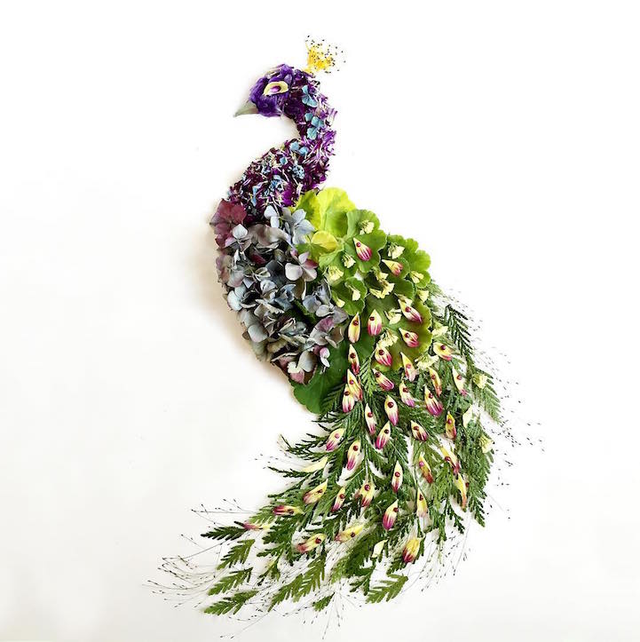 Using a variety of flowers, leaves, seeds, mosses, and more, the artist crafts her pieces with a love of nature in mind. Aside from the creatures she brings to life, Collins also depicts scenic landscapes featuring looming trees, sailing ships, flying kites, and even the crashing wave from Katsushika Hokusai's The Great Wave at Kanagawa. While she's arranging these organic compositions, Collins hopes to pay homage to the environmental beauty that surrounds us.