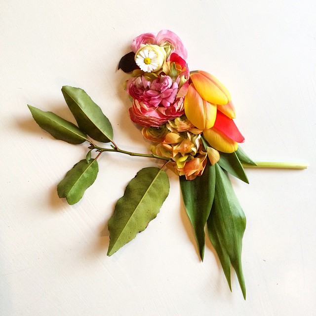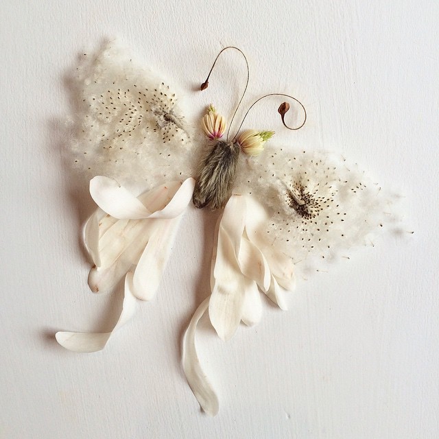 Seattle artist Bridget Beth Collins forages for her own art supplies and then uses these materials to create Mother Nature-inspired works of art. “I love to adventure into the wildflower woodlands, mossy waterfalls, and grey sand starry expanses of the Pacific Northwest,” Collins explains. “I forage almost all of my creations from foliage and flowers plucked from our sidewalks, meadows, and woods in our neighborhood. I have a small garden in the city, and my mother has a big rambling secret garden filled with old english roses in the sea town of Edmonds where I grew up.”