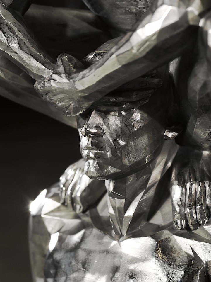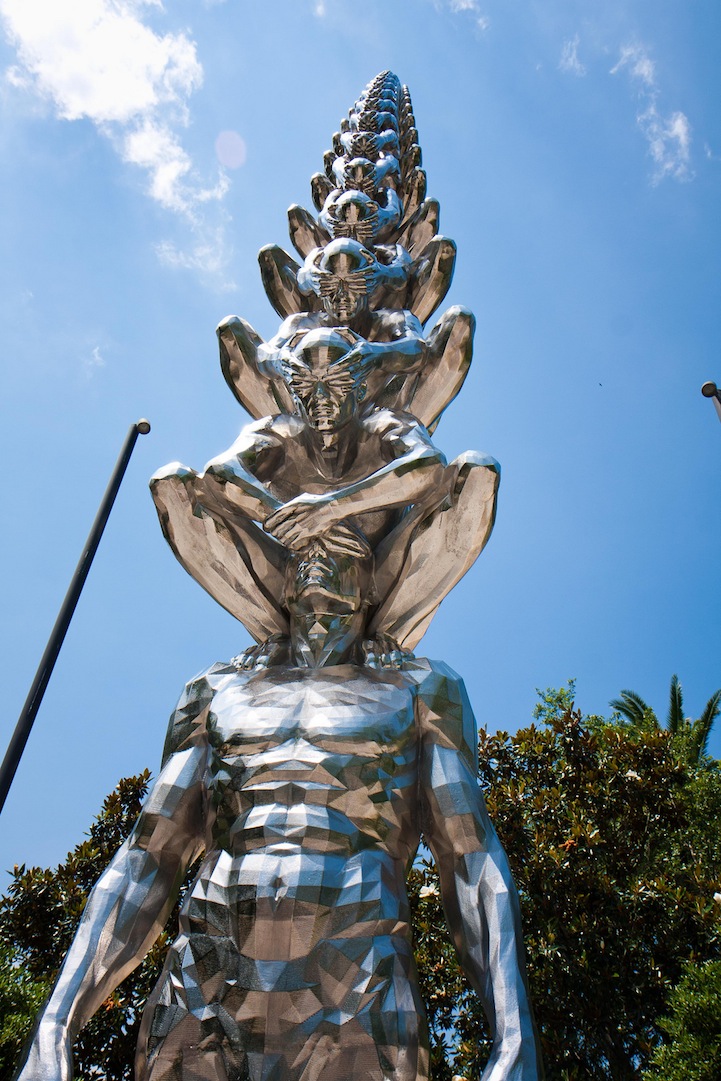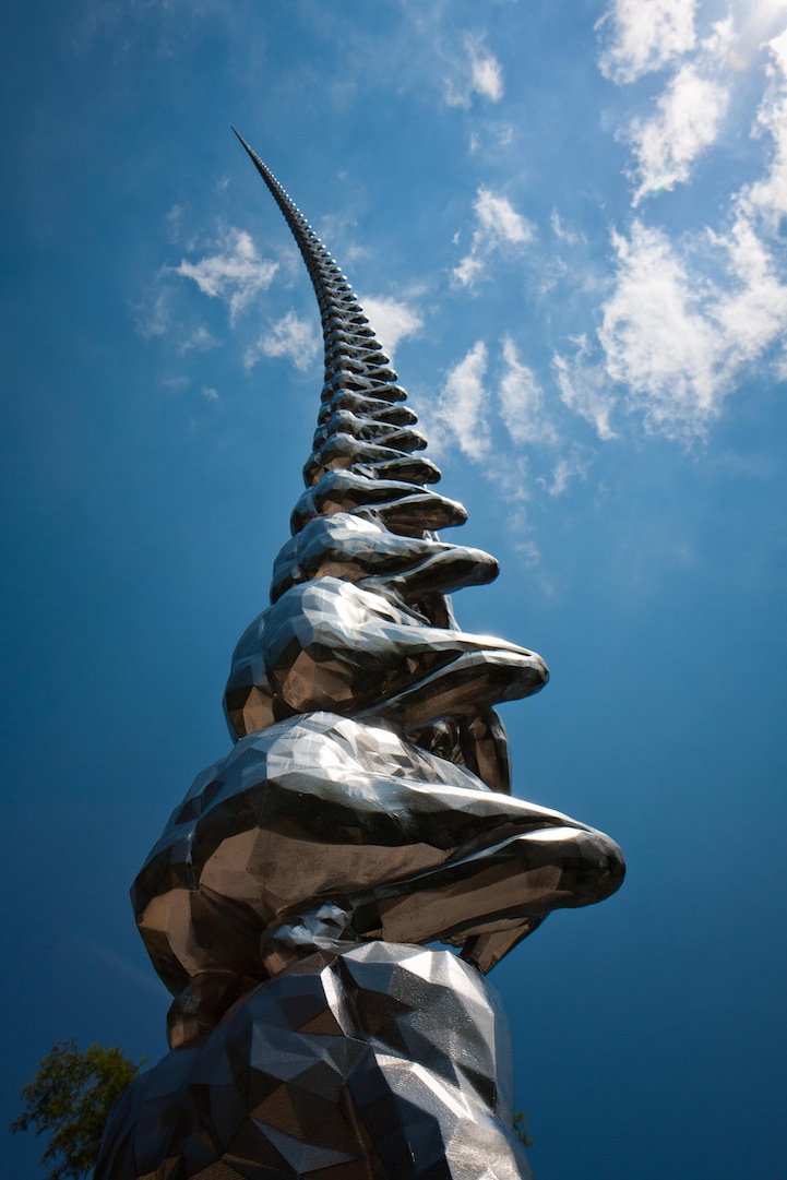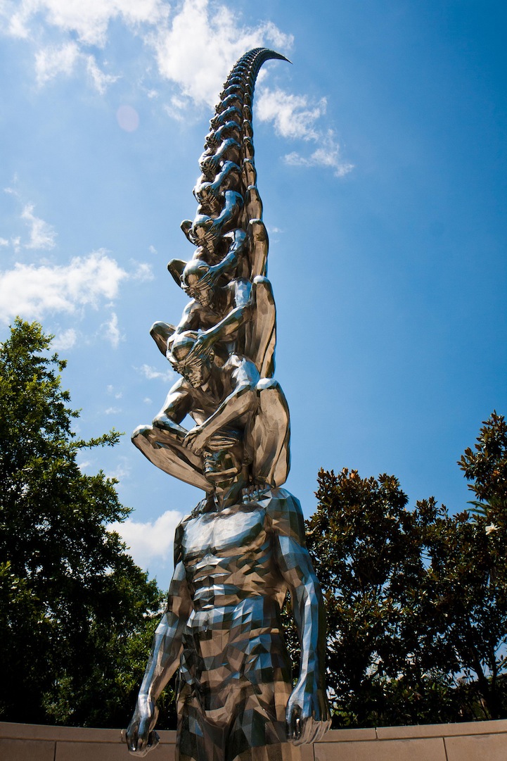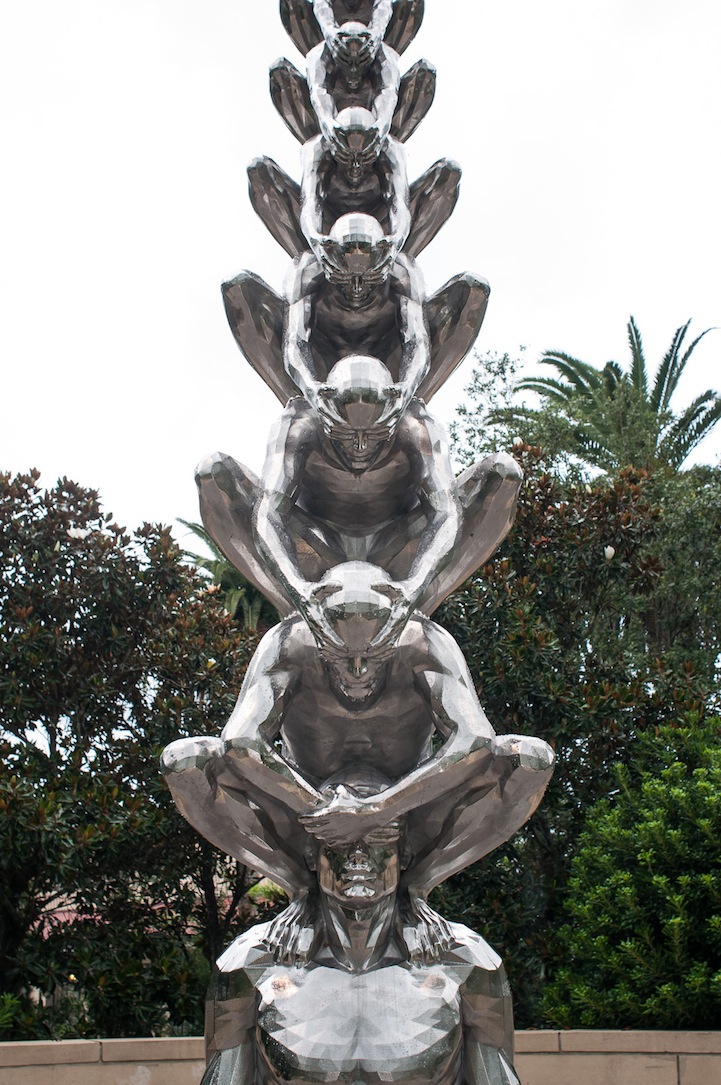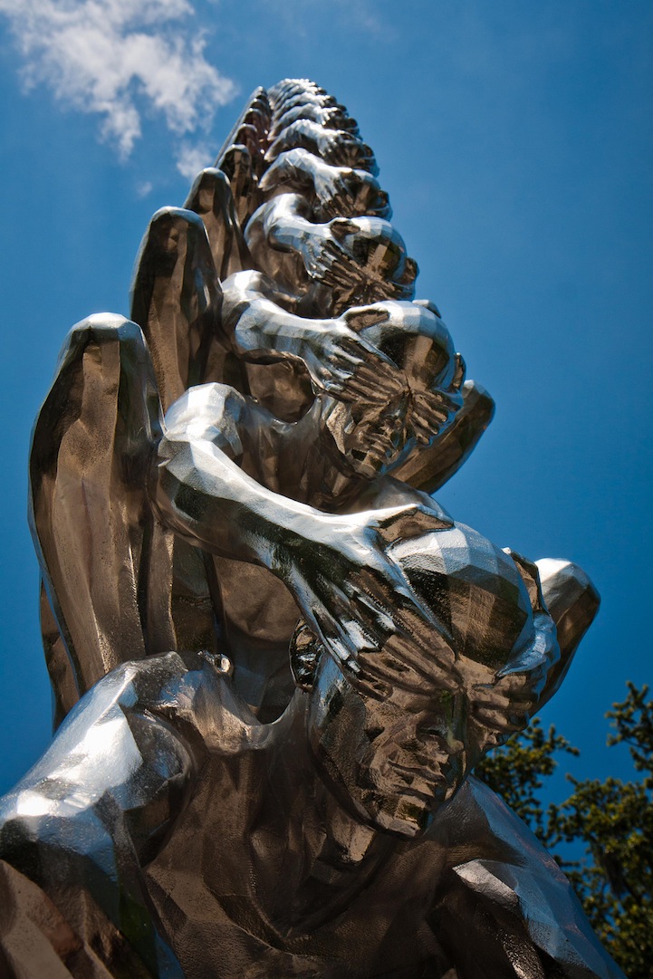 The artist has caught our attention over the years with misplaced houses, a robe made of dog tags, and symbolic floor installations; but it's his use of the human form that is most thought-provoking. His work continually questions one's identity and individuality by using the human body. These stainless steel men, though recognizably different entities, appear to move as one. While the piece is open for interpretation, it makes one question whether the idea behind it is to present the figure of a man blindly following in the path of his ancestors before him, who have risen a step closer to the heavens with each new successor in the lineage.
