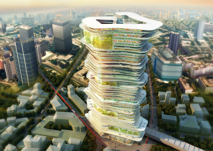 The structure's multiple floors are meant as flexible areas that are adaptable for many situations. They consist of plazas and communal spaces, offering breathtaking views of the surrounding landscape. Dynamic areas where people can meet are offset by intimate, quieter spots, too. The design of the building takes urban life and builds it upwards rather than outwards; it's an intriguing solution for a new development in an already dense city.