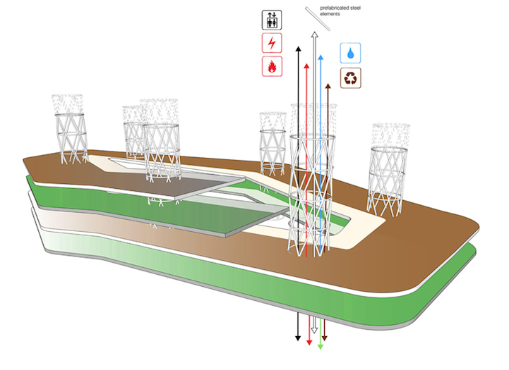 Endless City is meant to exist in London, and it's made up of six steel tubes located at the top that support two ramps. The tubes enclose different elements that are influx within the building including energy, waste, and water. Its overall shape attempts to maximize passive energy and reduce artificial lighting, cooling, and heating needs. When these things are required, they are distributed vertically along the ramps and are linked with bridges. The “endless” ramps meander throughout the skyscraper starting from the ground up.