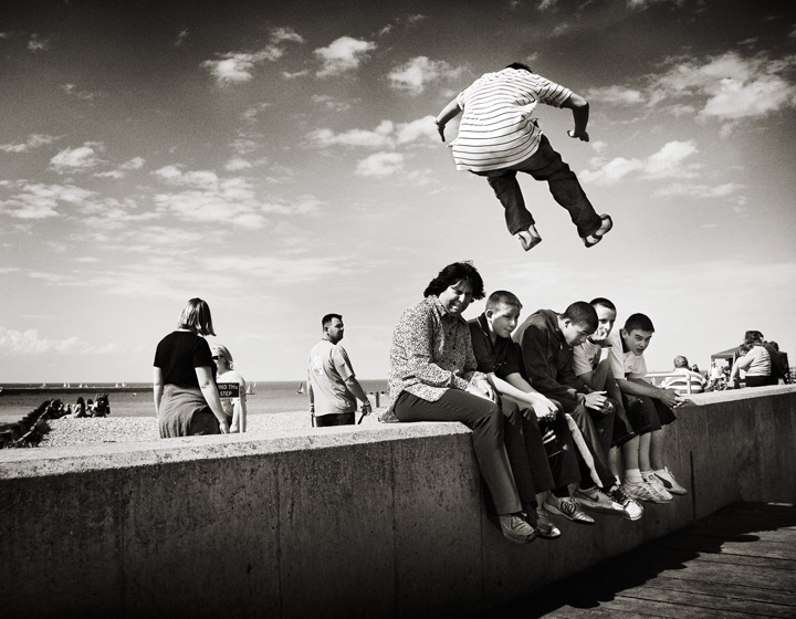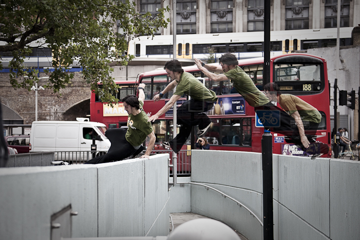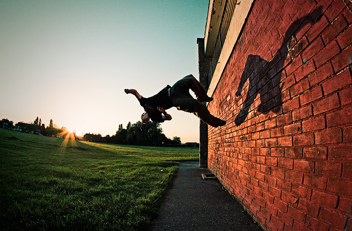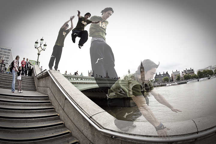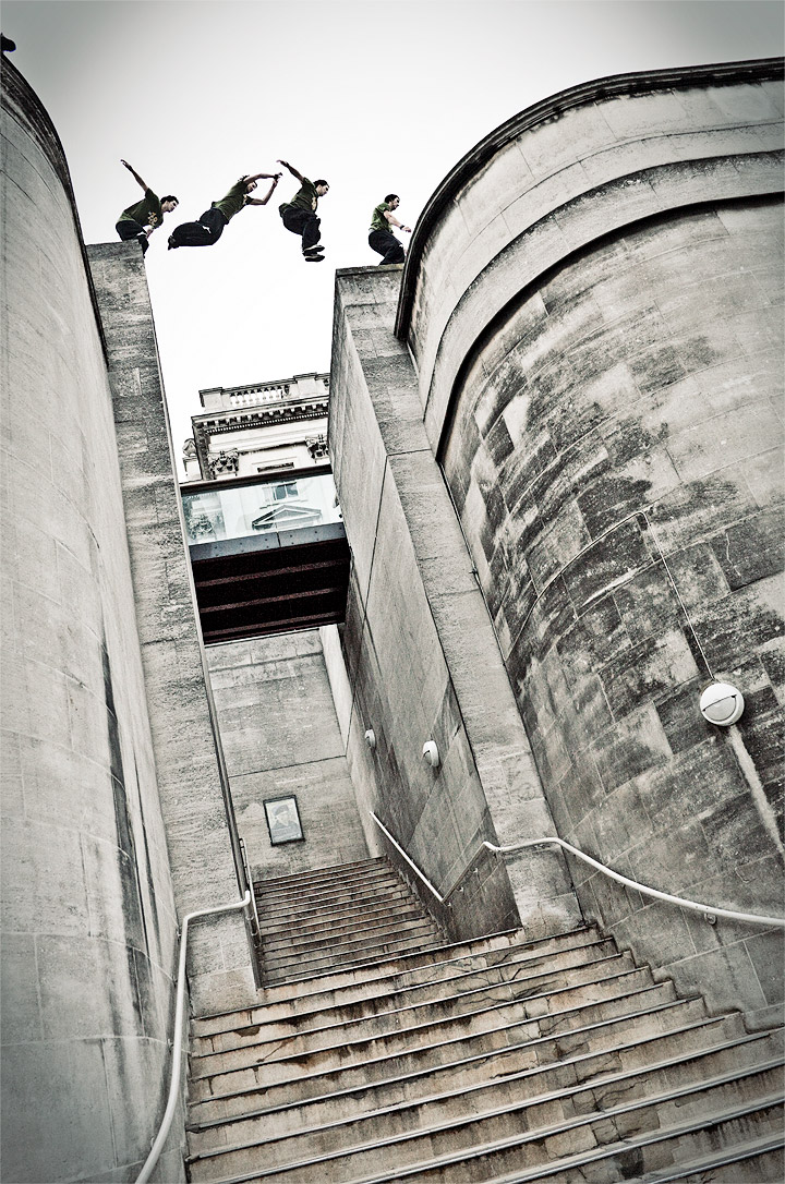 How many people are involved in Parkour? Do you do stunts as well? Parkour and freerunning are now global movements (calling it a sport does not do justice to what is sometimes an art-form and way of life). It's free, so anyone can do it. Often people walk this earth full of inhibition and mental constraints on their physical exploration of it. Parkour is a forgotten, logical, primeval skill waiting to be rediscovered and fine-tuned. It's an investment too, teaching its exponents about the world around them – and about the human beings with whom they share the environment, urban or otherwise. There are many thousands of people involved and it is growing all the time. I'd like to say that I do stunts too, but I'm behind the lens, not in front of it (for good reason too). Parkour is infectious though – it's tough not to try it once you witness the techniques and the seeming simplicity and grace exhibited. Let's just say that I don't do gates any more – or garden fences!