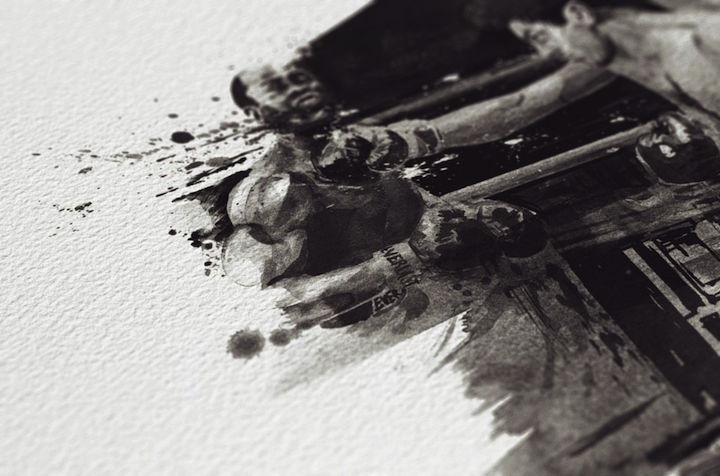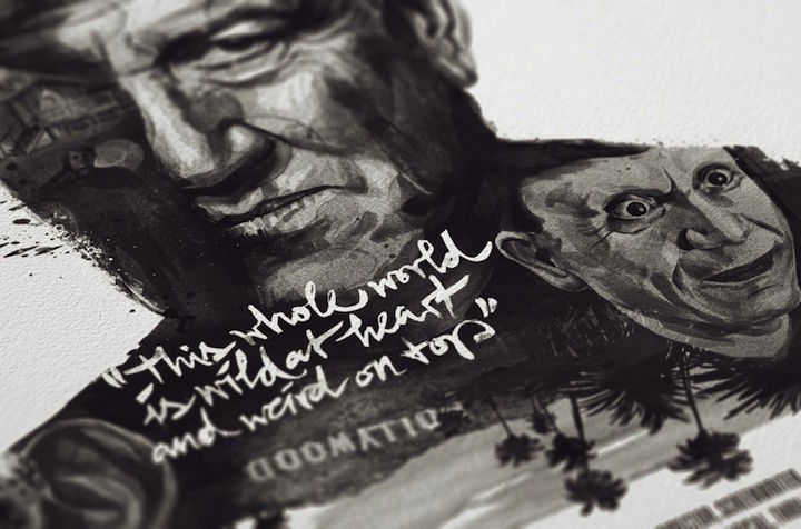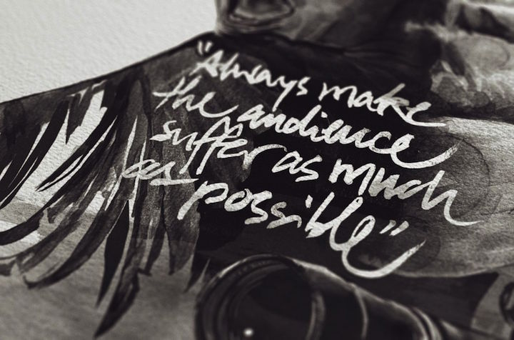 The prints were a true collaboration, in every sense of the word. While Julian created the illustrations, Steffen and Viktoria helped Julian with the overall concept and then worked in post-production – assisting in the typography, credits, blind embossing and photography. The works were made in both analogue and digital, with the analogue part including pen, ink and watercolor. The posters are printed as high quality gicle/fine-art prints on beautiful cotton paper stock. All are hand-signed and finished with an elegant embossing.