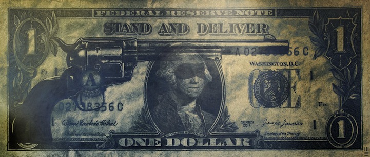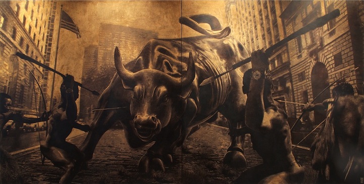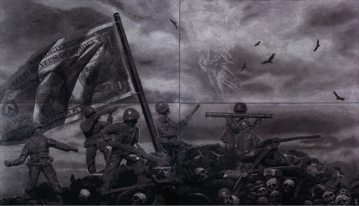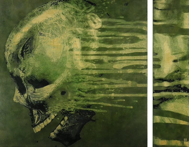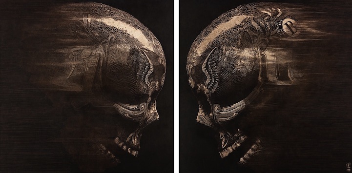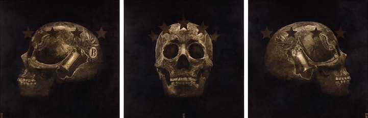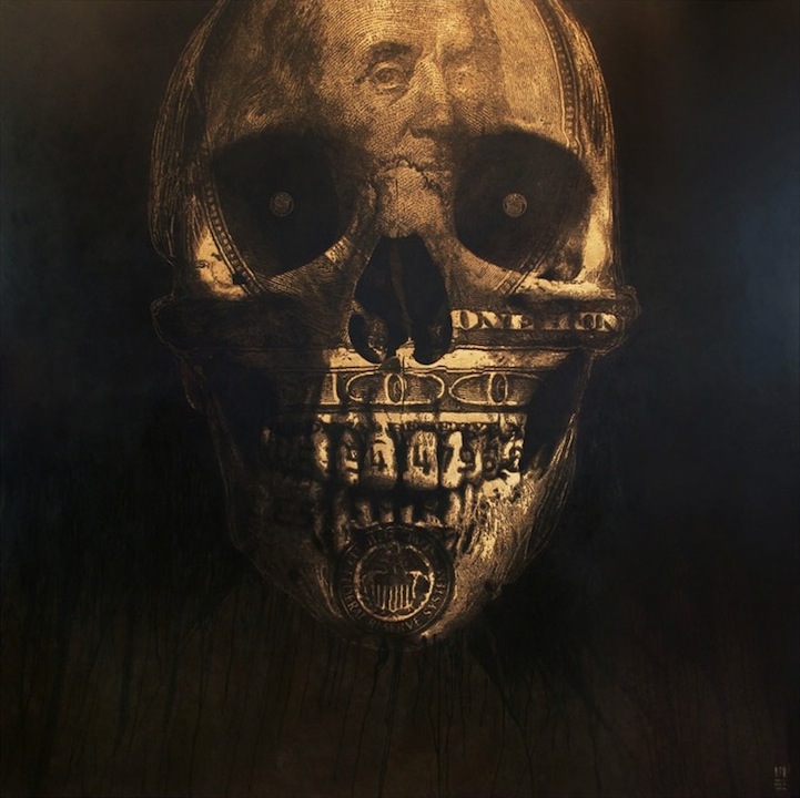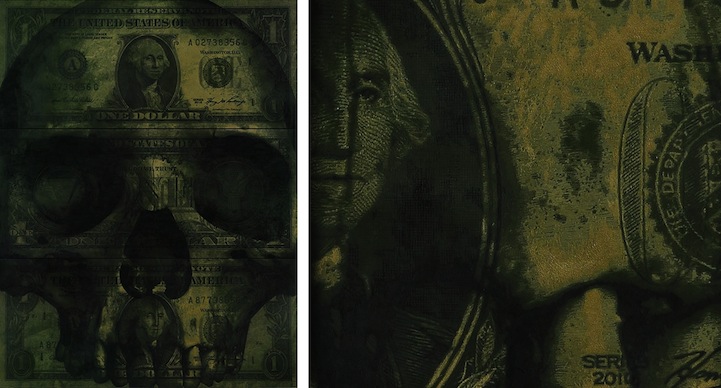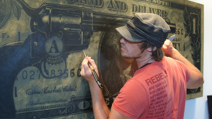 The artist's medium of choice, though an unusual one that leaves a lot of room for error, has proven to be the right match. Evans imports the animal hides from around the world to produce his labor-intensive pieces, each taking months to complete. He carves at the material to reveal different shades of the tanned leather and expose its suede finish. Each incision that Evans makes is a crucial laceration that can't be undone. His creative task is a time-consuming effort that produces astonishing results. The artist's work, heavily saturated with images of skulls and currency, reflect his own experiences, having grown up around much death, and comment on the adverse effects of greed.