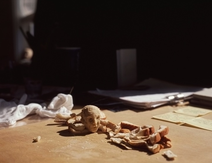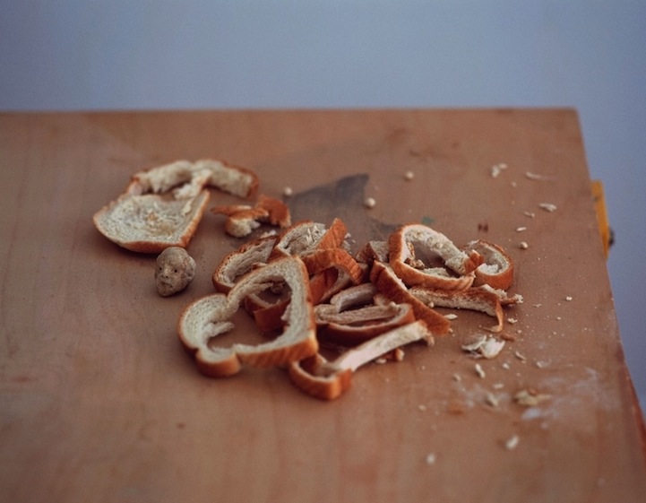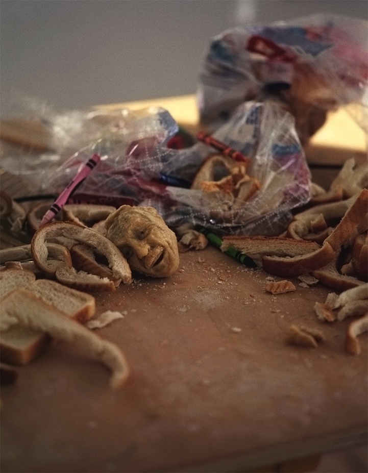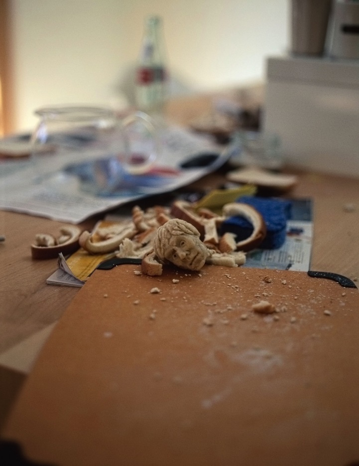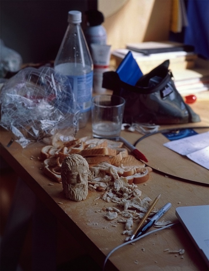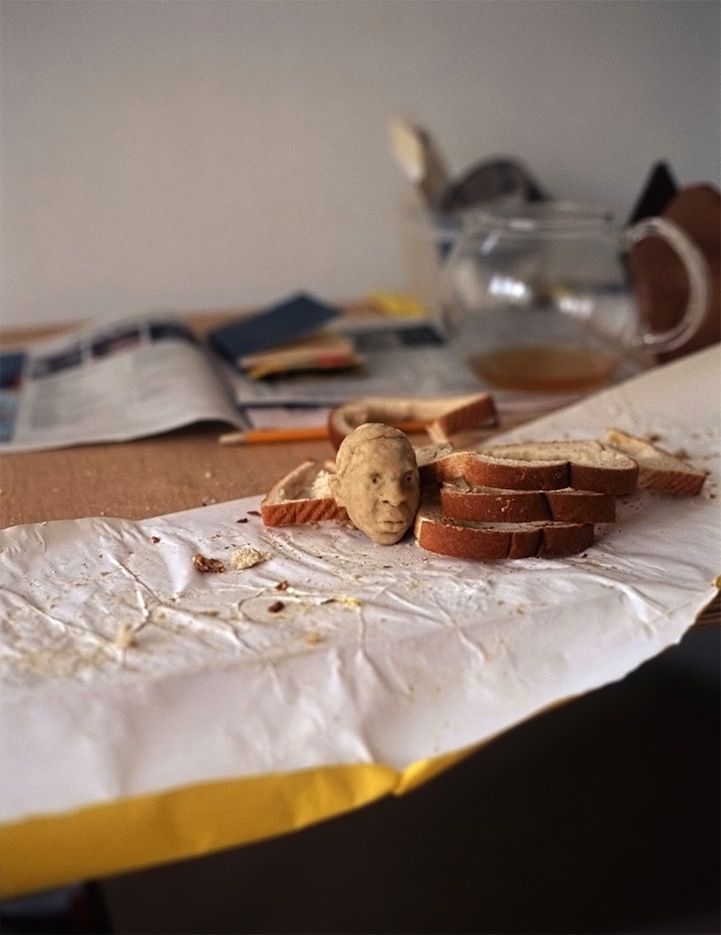 Within each blob of bread, the strands of hair, accurately shaped eyes, noses, and ears, and perfectly developed cheekbones depict characters like Plato, Lenin, Warhol, and Jay-Z. Korolczuk describes the monochromatic shapes as symbolic and material, marked with nutritional value. Within the many crumbs of an average breakfast, she finds inspiration to shape her meals into these remarkable sculptures. For presentation, the faces are photographed in their messy environments, piled among the remaining crusts that didn't make the cut for the final piece.