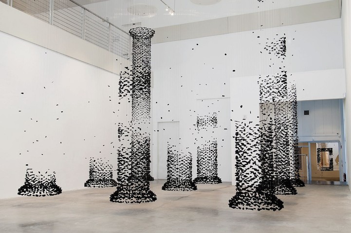 Seoul-based artist Seon Ghi Bahk is back with the latest works in his An aggregation series, consisting of delicate charcoal installations that hang from nylon threads to form a variety of representational and abstract shapes. The suspended pieces dangle in exact formations, constructing tall columns, dense orbs, and abstract droplets in various states of completion.