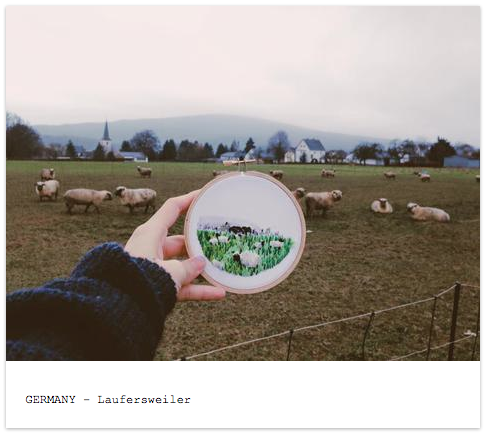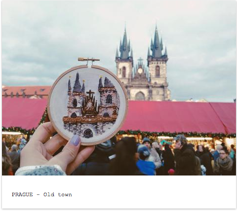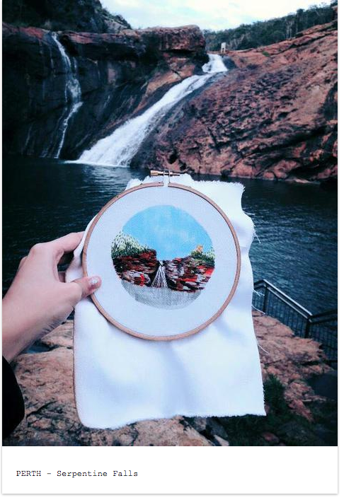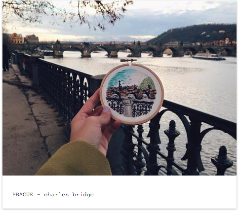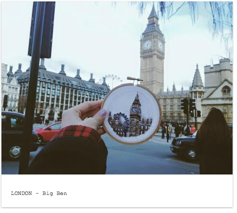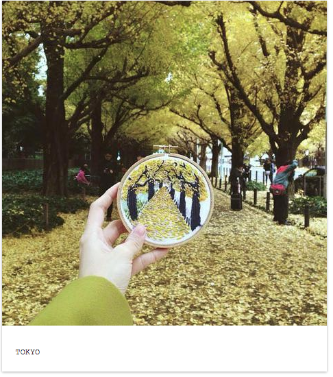 When she travels the world, Teresa Lim captures snapshots of her surroundings with needle and thread. In her series Sew Wanderlust, the artist embroiders surprisingly detailed canvases of places she visits on-site. This method of preserving memories lets her truly take in her surroundings. Lim must spend time sitting in one place, observing details and stitching as the scene unfolds. Unlike snapping quick photos, embroidering allows 24-year-old Lim to become a participant in the environment rather than a fleeting viewer.