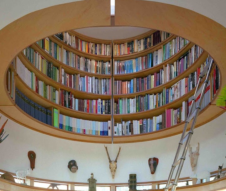 Probably the most awe-inspiring piece of the room, the overhead library complements the overall aesthetic of the space, from the circular floor pattern to the explorer's indigenous souvenirs that adorn the walls. Even the ladder that essentially cuts through the room doesn't serve as an eyesore, but rather as a completing element to an enviable writing studio.